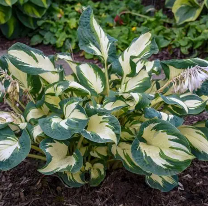 Funkia ‘Hans’ to wyjątkowa odmiana hosty wyróżniająca się efektownymi, dużymi liśćmi o fantazyjnie powyginanych brzegach. Ich kolorystyka jest bardzo dekoracyjna — centrum liścia ma odcień jasnej zieleni lub żółtawego kremu, natomiast szerokie marginesy są ciemniejsze, intensywnie zielone. Z czasem liście stają się jeszcze bardziej pofałdowane, tworząc spektakularną, gęstą kępę o wyrazistym charakterze. Roślina najlepiej rośnie w półcieniu lub cieniu, preferuje gleby żyzne i wilgotne, lecz dobrze przepuszczalne. Osiąga około 40–50 cm wysokości i imponuje szeroką, bujną kępą. Latem pojawiają się lawendowe lub jasnofioletowe kwiaty na smukłych pędach, które dodają roślinie lekkości. Funkia ‘Hans’ to znakomity wybór do cienistych rabat, nasadzeń pod drzewami oraz eleganckich kompozycji ogrodowych, gdzie jej ozdobne liście stanowią mocny akcent dekoracyjny przez cały sezon.