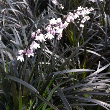 Konwalnik płaskopędowy ‘Nigrescens’ (Ophiopogon planiscapus ‘Nigrescens’) to niska bylina ozdobna o wąskich, ciemnofioletowych do niemal czarnych liściach, które tworzą zwarte, dekoracyjne kępy. Latem pojawiają się nad nimi drobne, dzwonkowate kwiaty w kolorze biało‑fioletowym, a po przekwitnieniu roślina wytwarza dekoracyjne czarne jagody. Roślina dorasta do około 20–30 cm wysokości i najlepiej rośnie w stanowiskach słonecznych lub półcienistych, na glebie żyznej, przepuszczalnej i umiarkowanie wilgotnej. Jest ceniona jako roślina okrywowa, obwódkowa i rabatowa, tworząc kontrastowe akcenty w ogrodzie, a także nadaje się do pojemników. Konwalnik ‘Nigrescens’ jest stosunkowo odporny na mróz, choć w chłodniejszych rejonach warto go osłonić na zimę.