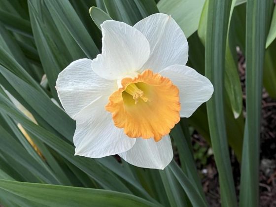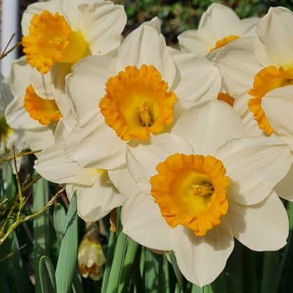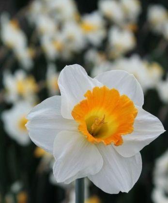 Narcyz ‘Orange Sunset’ (Narcissus sp.) to ozdobna odmiana narcyza o efektownych, dwubarwnych kwiatach. Płatki są białe, natomiast trąbka ma intensywny pomarańczowy kolor, który z czasem może przechodzić w odcień żółty lub melonowy, tworząc wrażenie wiosennego „zachodu słońca”. Roślina osiąga wysokość około 30–45 cm i wyrasta z cebul sadzonych jesienią. Kwitnie wczesną do średniej wiosny, zwykle od marca do kwietnia, w pełnym słońcu lub półcieniu na glebie lekkiej, przepuszczalnej i umiarkowanie wilgotnej. Odmiana jest mrozoodporna i corocznie tworzy zwarte kępy, doskonale nadając się zarówno do ogrodów, jak i na cięte bukiety dzięki dekoracyjnym, trwałym kwiatom.
