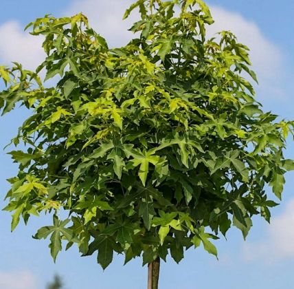 Niewielkie drzewko, w młodym wieku o kulistym, gęstym pokroju, starsze egzemplarze mają pokrój wąskostożkowaty. Dorasta do wysokości 3-4 m, a średnica korony może osiągnąć 2 m. Bardzo powolny wzrost. Liście 5-7-klapowe, ciemnozielone, jesienią przebarwiają się na czerwono.