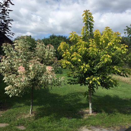 Małe drzewo lub duży krzew o szerokiej koronie i efektownych liściach. Osiąga 5 m wysokości i 4 m szerokości. Młode liście różowe, później białopstre. Gatunek o małych wymaganiach glebowych i dużej odporności na trudne warunki. Polecany do małych ogrodów, do zestawień kolorystycznych, szczególnie z roślinami o ciemnym zabarwieniu.