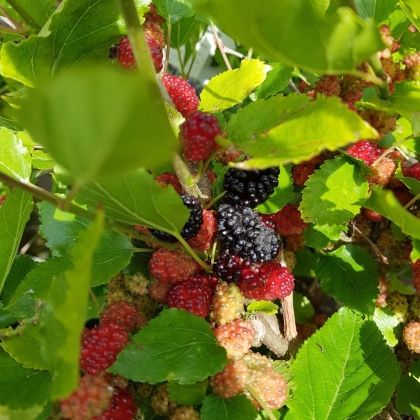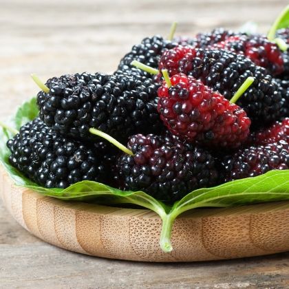Największą ozdobą tej odmiany są liczne, podłużne owoce przypominające jeżyny. Początkowo są czerwone, a w miarę dojrzewania stają się ciemnofioletowe lub prawie czarne. Owoce są słodkie, soczyste i bardzo smaczne. Morwa Mojo Berry owocuje od czerwca aż do września, często kilka razy w sezonie, ponieważ roślina powtarza owocowanie na młodych pędach.