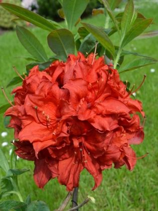 Zwarty, rozłożysty krzew. Liście sezonowe, zielone. Młode przyrosty z brązowym odcieniem. Kwiaty intensywnie czerwone przez cały okres, nie blednące na słońcu, z wyraźnymi białymi pręcikami, z górnym płatkiem korony nieco jaśniejszym, duże, zebrane po kilkanaście sztuk w szerokie, kuliste kwiatostany. Kwitnie obficie i corocznie pod koniec maja. Wymaga stanowisk słonecznych lub półcienistych oraz gleb kwaśnych, umiarkowanie wilgotnych i próchnicznych. Mrozoodporność dobra. Odmiana polecana do ogrodów przydomowych. Ładnie prezentuje się na rabatach razem z różanecznikami i karłowymi azaliami japońskimi.
