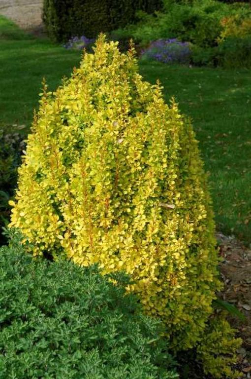 Berberys Golden Torch to dekoracyjny krzew liściasty o wąskim, kolumnowym pokroju, idealny do mniejszych ogrodów oraz nowoczesnych nasadzeń. Jego największą ozdobą są intensywnie złocistożółte liście, które przez cały sezon utrzymują jasną barwę i pięknie rozświetlają rabaty. Dzięki wyprostowanemu wzrostowi roślina zachowuje elegancki, uporządkowany wygląd.