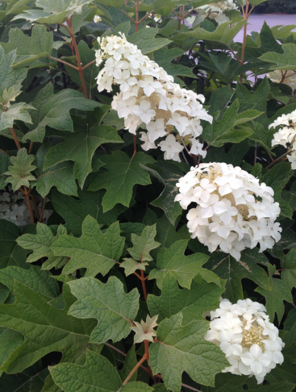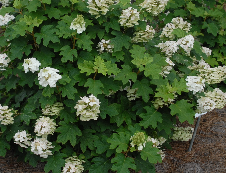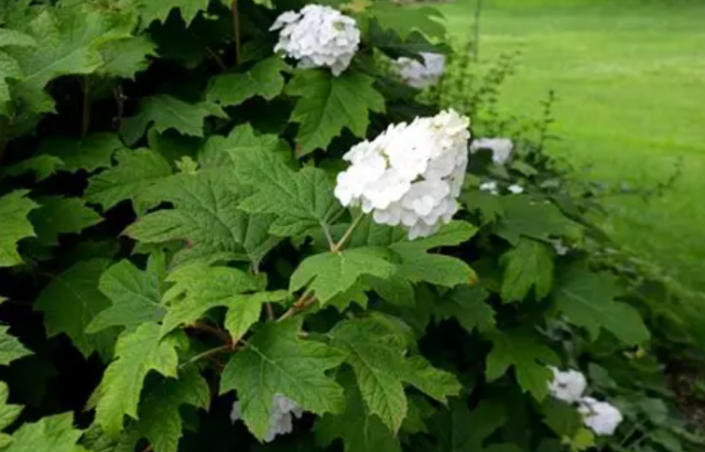 Szeroki krzew o wys. do 1,5 m rozrasta się na szerokość dzięki rozłogowym pędom. Liście duże, „dębopodobne”, od spodu owłosione, jesienią czerwonofioletowe, pozostają na pędach do późnej jesieni. Kwiaty białe, w długich, okazałych wiechach, rozwijają się w VII i VIII. Lubi żyzne, dostatecznie wilgotne, lekko kwaśne gleby. Niska mrozoodporność, wymaga zabezpieczania na zimę oraz zacisznych, osłoniętych stanowisk.