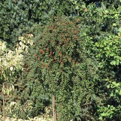 Krzew w formie piennej z prawie poziomymi pędami i charakterystycznymi, podobnymi do ości ryby, rozgałęzieniami. Liście błyszczące, ciemnozielone, przebarwiające się jesienią na pomarańczowo. Kwiaty biało różowe. Owoce czerwone, długo pozostające na krzewie. Toleruje wszystkie rodzaje uprawnych gleb ogrodowych. Polecana do ogrodów.