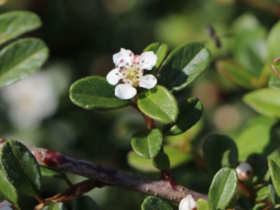 Silnie rosnący, częściowo płożący się krzew z długimi, rozgałęzionymi pędami. Dorasta do 1 m wys. Liście zimozielone, błyszczące, ciemnozielone, pomarańczowoczerwone jesienią. Kwiaty białe, V-VI. Owoce jaskrawoczerwone. Stanowisko słoneczne do zacienionego. Toleruje wszystkie zasobne, ogrodowe gleby. Doskonale znosi cięcie. Dobra roślina okrywowa, szybko pokrywająca duże powierzchnie.
