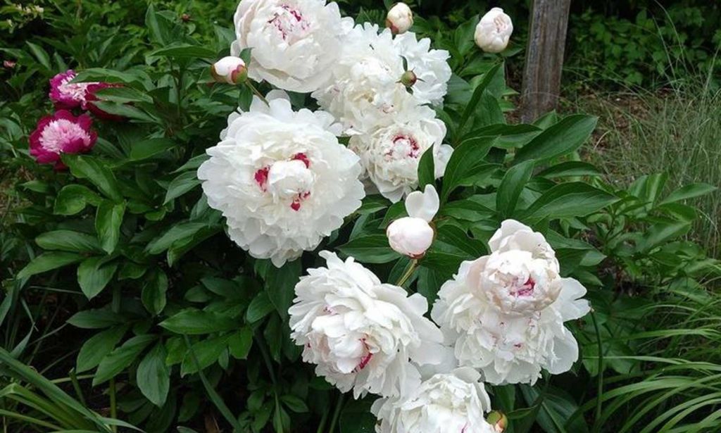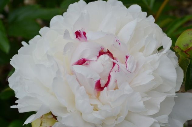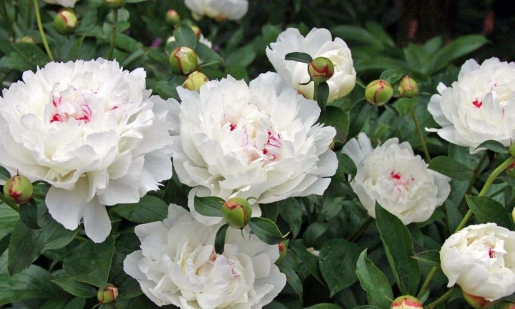 Piwonia ‘Festiva Maxima’ (Paeonia lactiflora ‘Festiva Maxima’) to klasyczna bylina ozdobna o dużych, pełnych, białych kwiatach z delikatnymi czerwonymi lub bordowymi plamkami w centrum, które dodają elegancji i kontrastu. Kwiaty są intensywnie pachnące i osadzone na mocnych, wzniesionych łodygach, dzięki czemu świetnie nadają się na kwiat cięty. Roślina tworzy zwartą kępę ciemnozielonych, błyszczących liści i dorasta do około 80–90 cm wysokości. Najlepiej rośnie na stanowiskach słonecznych lub lekko zacienionych, w glebie żyznej, przepuszczalnej i umiarkowanie wilgotnej. Piwonia ‘Festiva Maxima’ jest mrozoodporna i może rosnąć w jednym miejscu przez wiele lat, a jej kwitnienie przypada późną wiosną i wczesnym latem (zwykle od maja do czerwca), tworząc efektowną dekorację w ogrodzie.