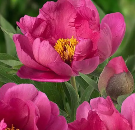 Paeonia × hybrida ‘Pink Ardour’ to wyjątkowa piwonia z grupy mieszańców Itoh, ceniona za duże, pełne kwiaty w intensywnym, nasyconym odcieniu różu. Kwiaty osiągają średnicę około 15–20 cm i zachwycają elegancką, harmonijną budową oraz jedwabistą strukturą płatków. W centrum często widoczne są złociste pręciki, które subtelnie rozświetlają głębię barwy i dodają kwiatom wyrazistości. Odmiana może wydzielać delikatny, przyjemny zapach, szczególnie wyczuwalny w ciepłe dni.