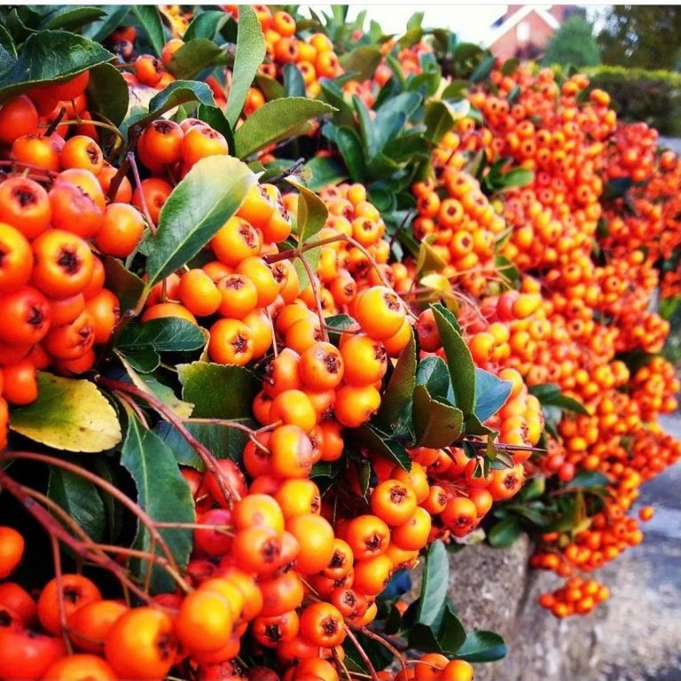 Silnie rosnący krzew o sztywych, wyprostowanych pędach zaopatrzonych w liczne, ostre ciernie, osiągający 2,5 metry wysokości oraz 1,5 m średnicy. Skórzaste, lancetowate liście są z wierzchu ciemnozielone, błyszczące, od spodu jaśniejsze, w młodości owłosione. W rejonach o łagodnym klimacie liście pozostają przez okres zimy zielone, natomiast tam, gdzie występują silniejsze spadki temperatur i mróz utrzymuje się dłużej, liście najczęściej zasychają i opadają. W maju lub na początku czerwca na krzewach pojawiają się białe kwiaty zebrane w gęste, szerokie baldachogrona. Jaskrawopomarańczowe owoce wielkości ziaren grochu dojrzewają we wrześniu i październiku, w środku zawierają 5 pestek. Skórka owoców jest pomarańczowa, pokryta woskowym nalotem, błyszcząca. Owoce zawiązują się zwykle bardzo obficie i długo pozostają na krzewach, nawet do końca grudnia.