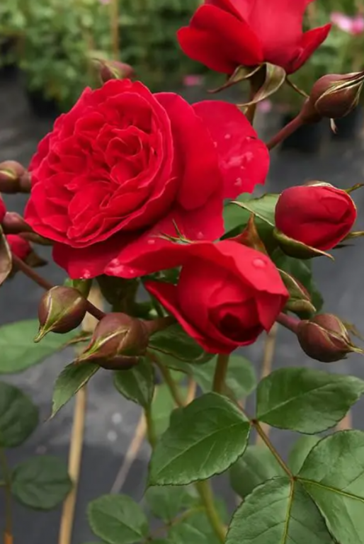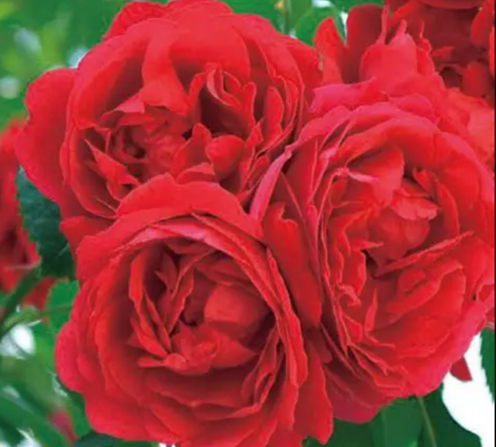 Róża pnąca ‘Deep Love’ (Rosa ‘Deep Love’) to efektowna odmiana o dużych, pełnych kwiatach w intensywnym, głębokim czerwonym kolorze z aksamitnym połyskiem. Kwiaty osiągają średnicę około 8–10 cm, mają elegancką, klasyczną budowę i często zebrane są w niewielkie kiście. Ich wyrazista barwa pięknie prezentuje się na tle ciemnozielonych, błyszczących liści. W sprzyjających warunkach kwiaty wydzielają delikatny, przyjemny zapach.