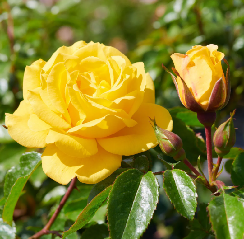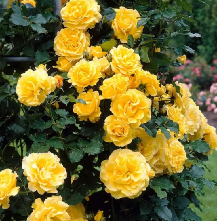 Róża pnąca ‘Dukat’ (Rosa ‘Dukat’) to atrakcyjna odmiana o dużych, pełnych kwiatach w intensywnym, słonecznym odcieniu żółci. Kwiaty osiągają średnicę około 8–10 cm, mają klasyczną budowę i pojawiają się pojedynczo lub w niewielkich kiściach. Ich jasna, ciepła barwa pięknie rozświetla ogród i dobrze komponuje się zarówno z roślinami o ciemnych liściach, jak i z innymi różami w kontrastowych kolorach. W sprzyjających warunkach kwiaty wydzielają delikatny, przyjemny zapach.