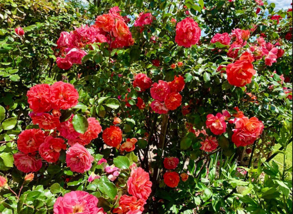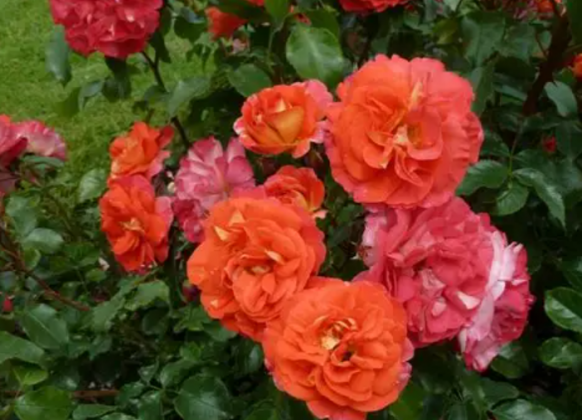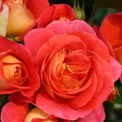 Róża wielokwiatowa GEBRÜDER GRIMM (Rosa ‘Gebrüder Grimm’) to bardzo dekoracyjna odmiana róży ogrodowej wyróżniająca się niezwykłą barwą kwiatów. Kwiaty są duże, pełne i mają intensywny pomarańczowo-czerwony kolor z żółtawym lub morelowym odcieniem, który może się zmieniać w trakcie kwitnienia. Dzięki temu krzew wygląda bardzo efektownie i przyciąga uwagę w ogrodzie. Kwiaty zebrane są w niewielkie kwiatostany i pięknie kontrastują z ciemnozielonymi, błyszczącymi liśćmi.